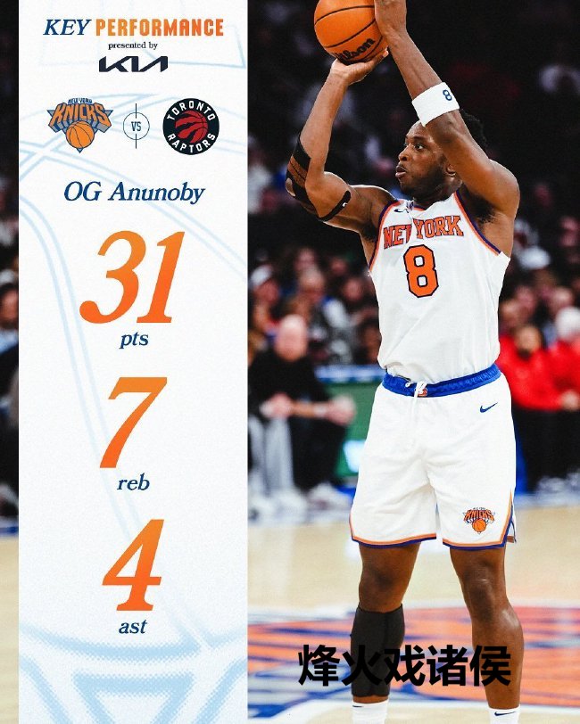 尼克斯(19-10):唐斯31分10篮板7助攻、阿努诺比31分7篮板4助攻、佩恩19分、布伦森12分7助攻、麦克布莱德12分4篮板5助攻、哈特11分、